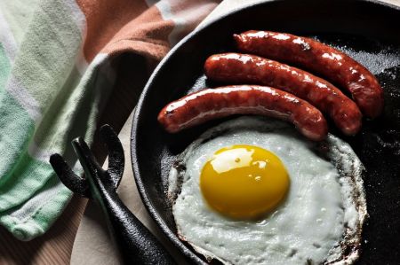 A cooked English breakfast often includes bacon, eggs, sausages and ……